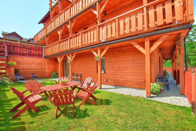 Bezpośrednio z apartamentu można przejść do części ogrodowej, wyposażonej w wygodne meble ogrodowe.