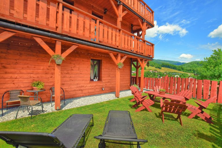 Bezpośrednio z apartamentu można przejść do części ogrodowej, wyposażonej w wygodne meble ogrodowe i podziwiać masyw Skolnitego.